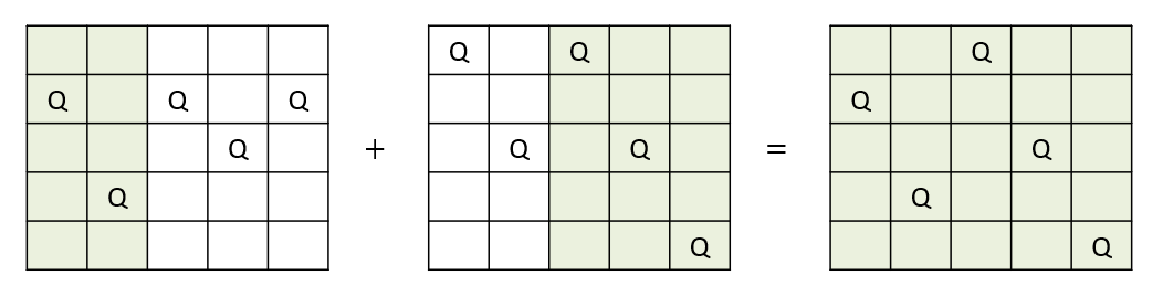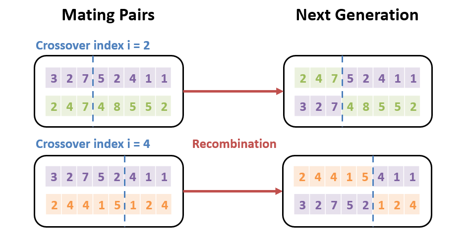 For the N-Queens problem, this can be done by choosing an index from which each mating pair creates a pair of “crossovers” with the property that, for parents , child 1 = and child 2 = .