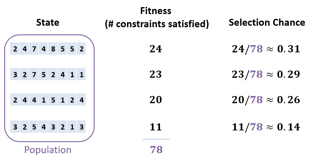 Component 1: Fitness and Selection: a Fitness Function/Score is the objective function from local search that decides the quality of a given state. A higher fitness means that it is more likely to be selected for mating.