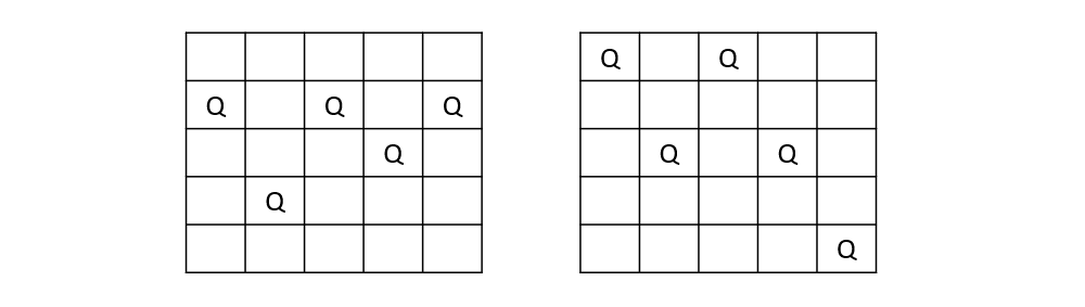 Consider the following two (incorrect) instantiations of the 5-Queens problem.