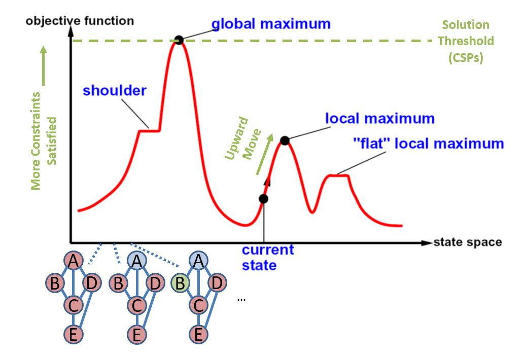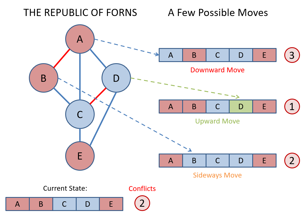 In the figure above, the current state is one that might be encountered after a random guess or after a modification of the state. Each move (a reassignment to one of the variables) can be classified as an upward, sideways, or downward move (up the hill, across a plateau, and down the hill, respectively).