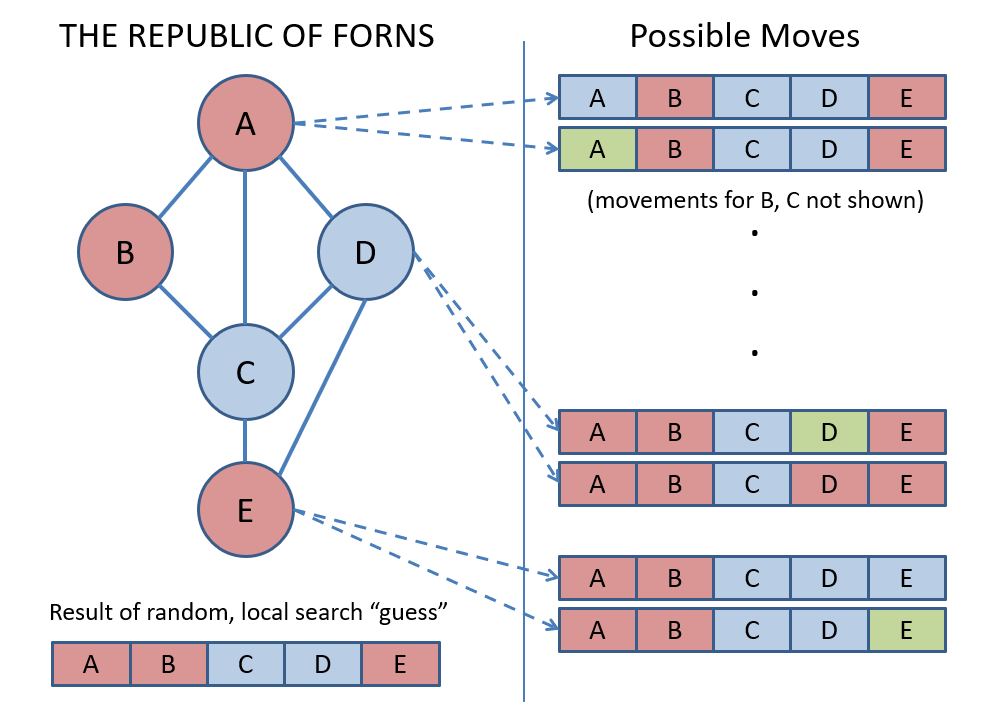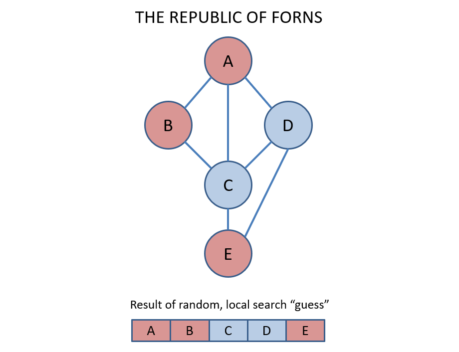 Let’s consider the Republic of Forns Map Coloring problem with colors.