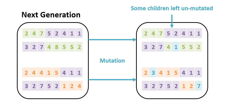 Component 3: Mutation: In order to avoid getting stuck in local maxima, there is also some chance that each crossover in the new generation may have a small mutation to its genetic structure.