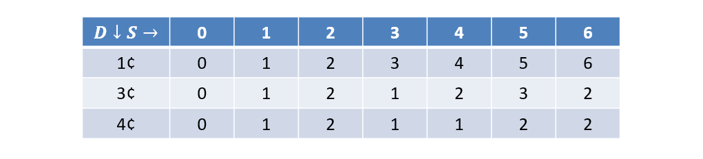 - To the left of that cell, i.e., for some column less than = using one coin of the new denomination in addition to the remainder.