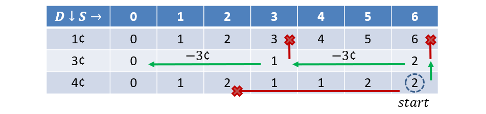 We can think of each cell as being a mini-min-node that asks: “Is the best way to make this column’s sum using a previous sub-problem’s solution (with a subset of denominations), or by using my row’s new coin?“.