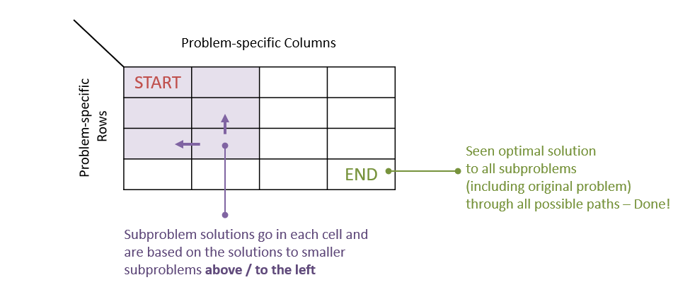 - End: where we end the operation with the optimal solution to the largest sub-problem / original problem.