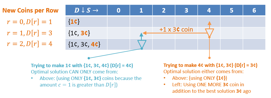 - From here on out, we’ll focus on just at each row (and so drop the set notation), but can remember this interpretation for each row: trying to solve each sub-problem with a subset of coins.