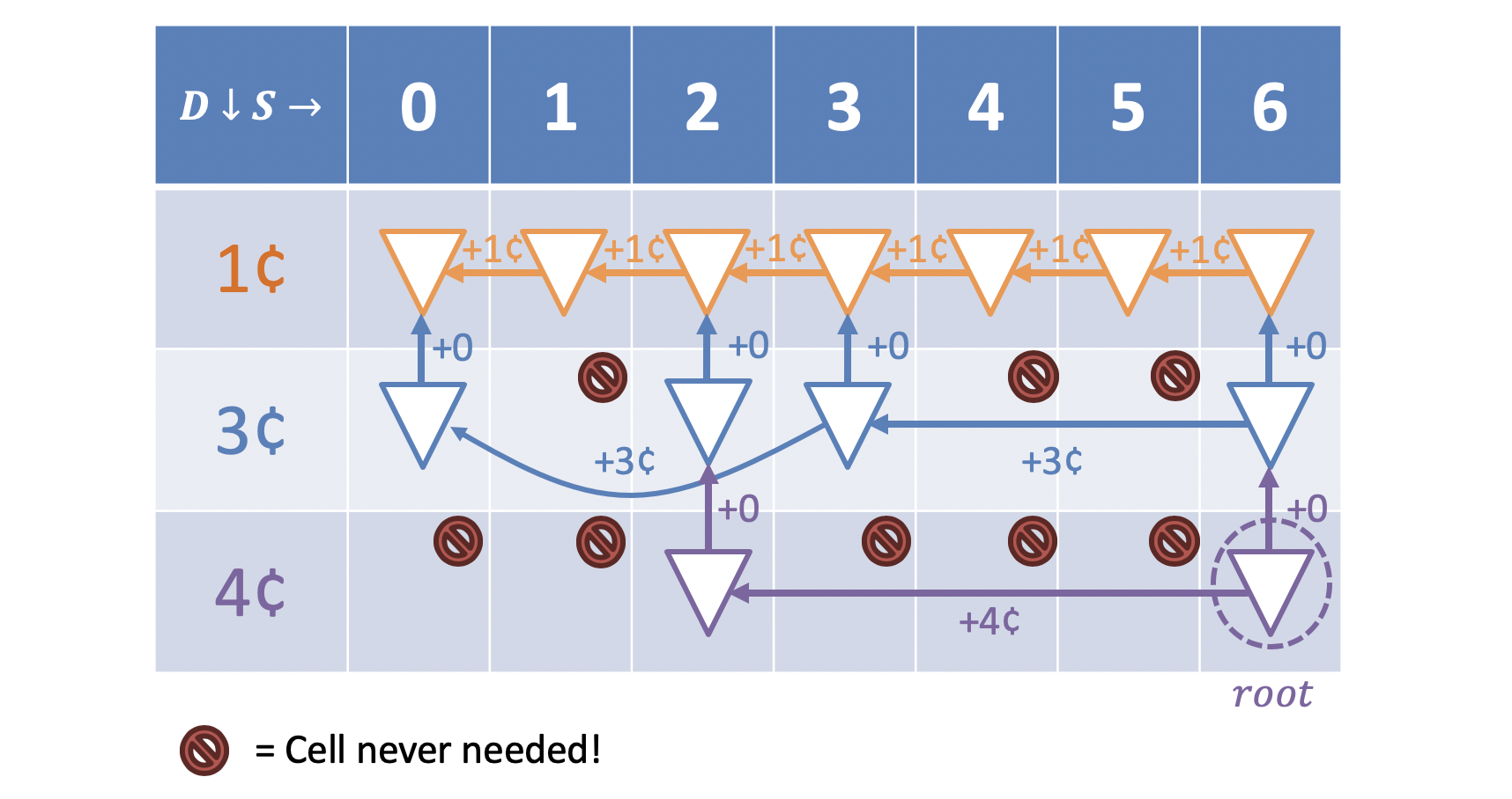 This way, we guarantee that we’re never missing a better way to make that column’s amount of change because we’ll have already seen the best way to do it using smaller denominations.