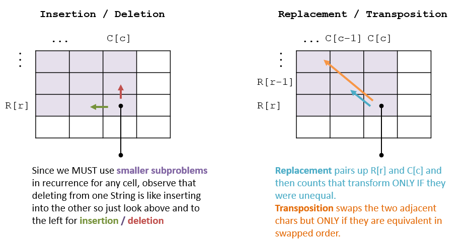 - We’re going to examine only the most recently “appended” characters to each of the row and column strings as a way of working backwards to the base case.