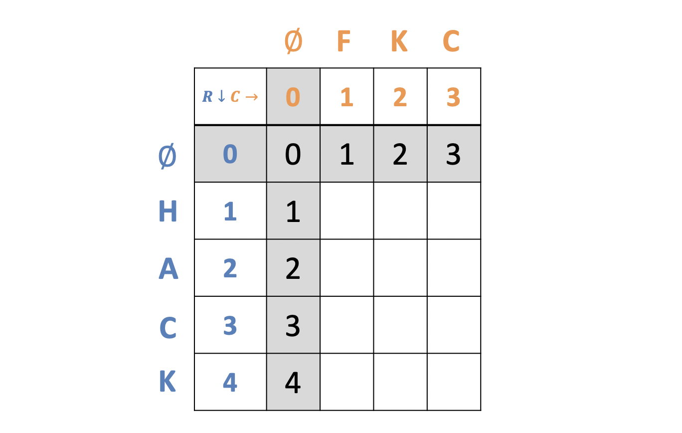 Each cell contains the number of letters that would be needed to be removed/added to get from each string to the empty string. These gutters now serve as our base cases for the recurrence that follows.