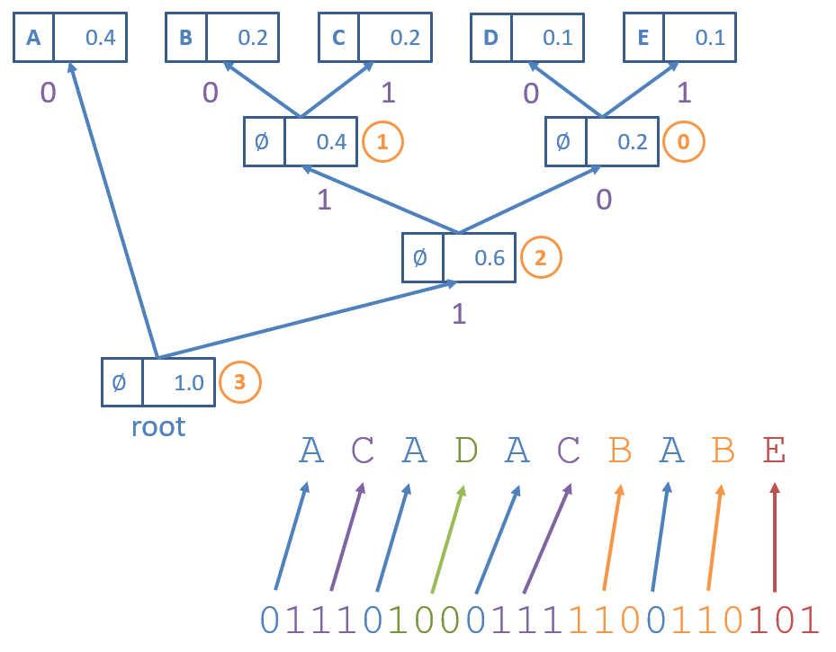 zeroChildreference whenever a 0 is encountered in the bitstring, and theoneChildreference when a 1 is encountered. - Add the letter corresponding to a leaf node to the output whenever the above traversal hits a leaf.