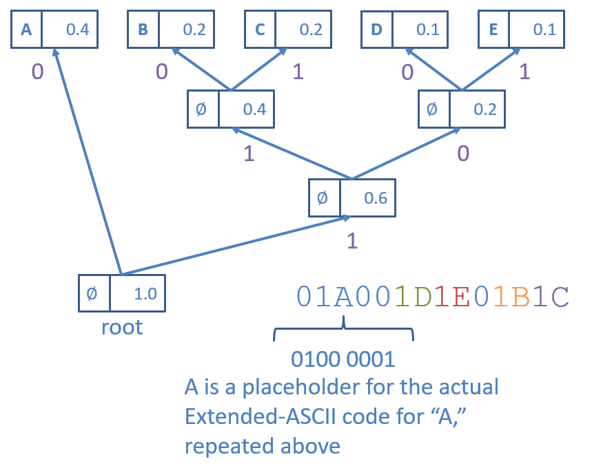 - The compressed bitstring associated with the Huffman Encoding is 22 bits, compared to the 80 bits required by Extended-ASCII to encode this corpus.