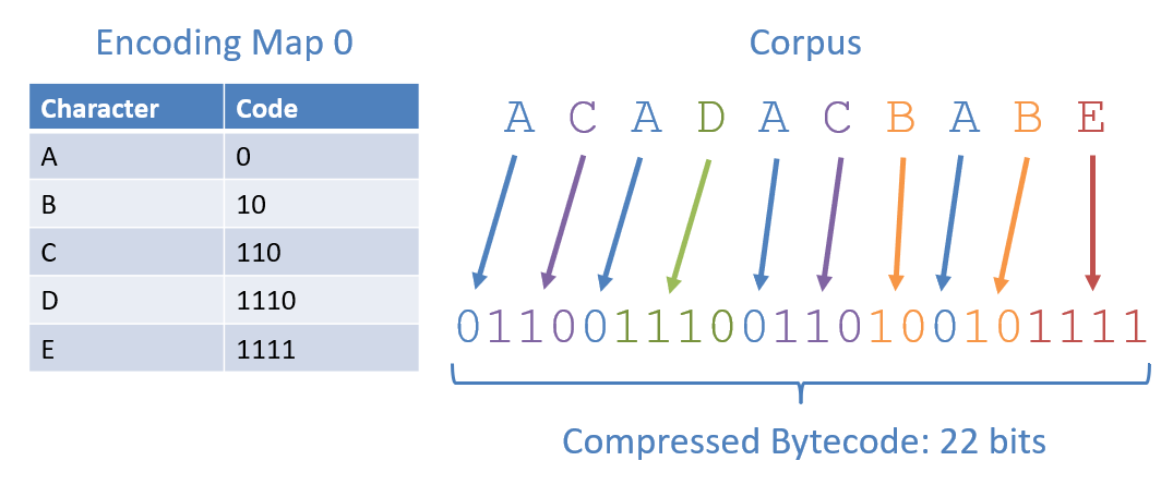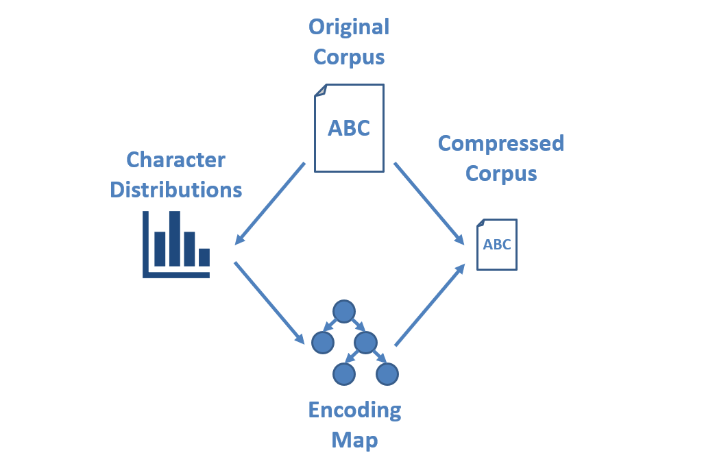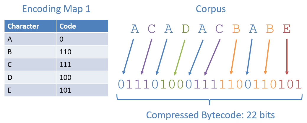- Performs this compression by finding a variable-length, prefix-free encoding that is influenced by the rarity of each character in the corpus.