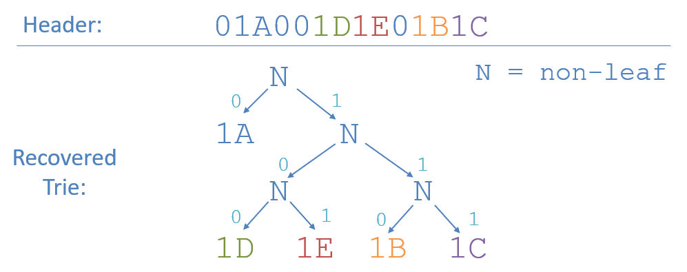 A simple approach to converting the Huffman Trie into the bitstring’s header is to perform a preorder traversal of the trie: